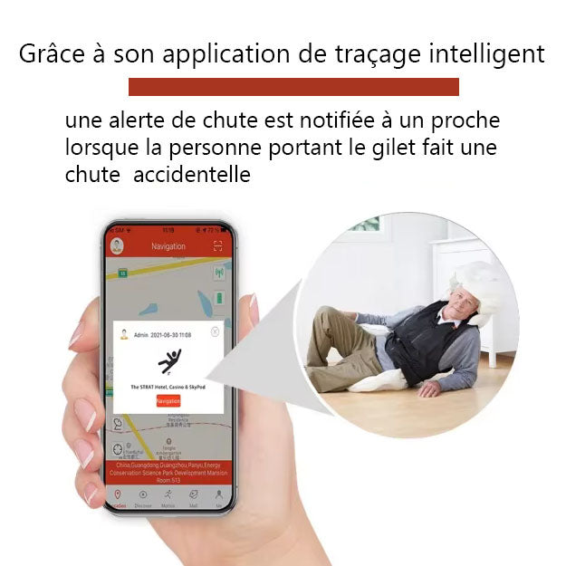 SURVEILLANCE VIA APPLICATION : L'application "S-AIRBAG" est disponible sur Android et l'App Store. Lorsque ce gilet de protection est connecté à l'application, l’état du porteur peut être suivi via un smartphone. Plusieurs tuteurs peuvent être ajoutés pour recevoir des alertes en cas de chute accidentelle, même à distance. De plus, les tuteurs peuvent localiser le porteur grâce à la navigation GPRS et suivre ses déplacements tout au long de la journée.
